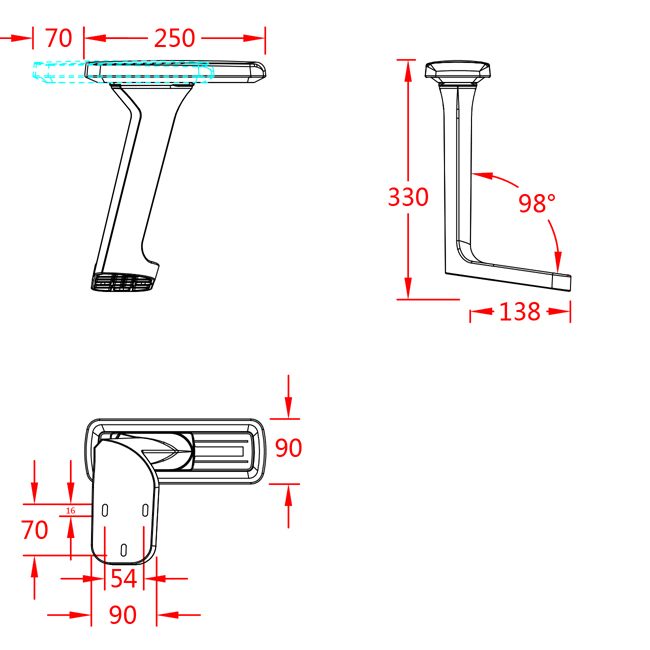 Features: • armrest pad depth adjustment 70mm. • 2 different armrest pad style choice. • Material:PA+GF30% carrier,soft PU pad.
